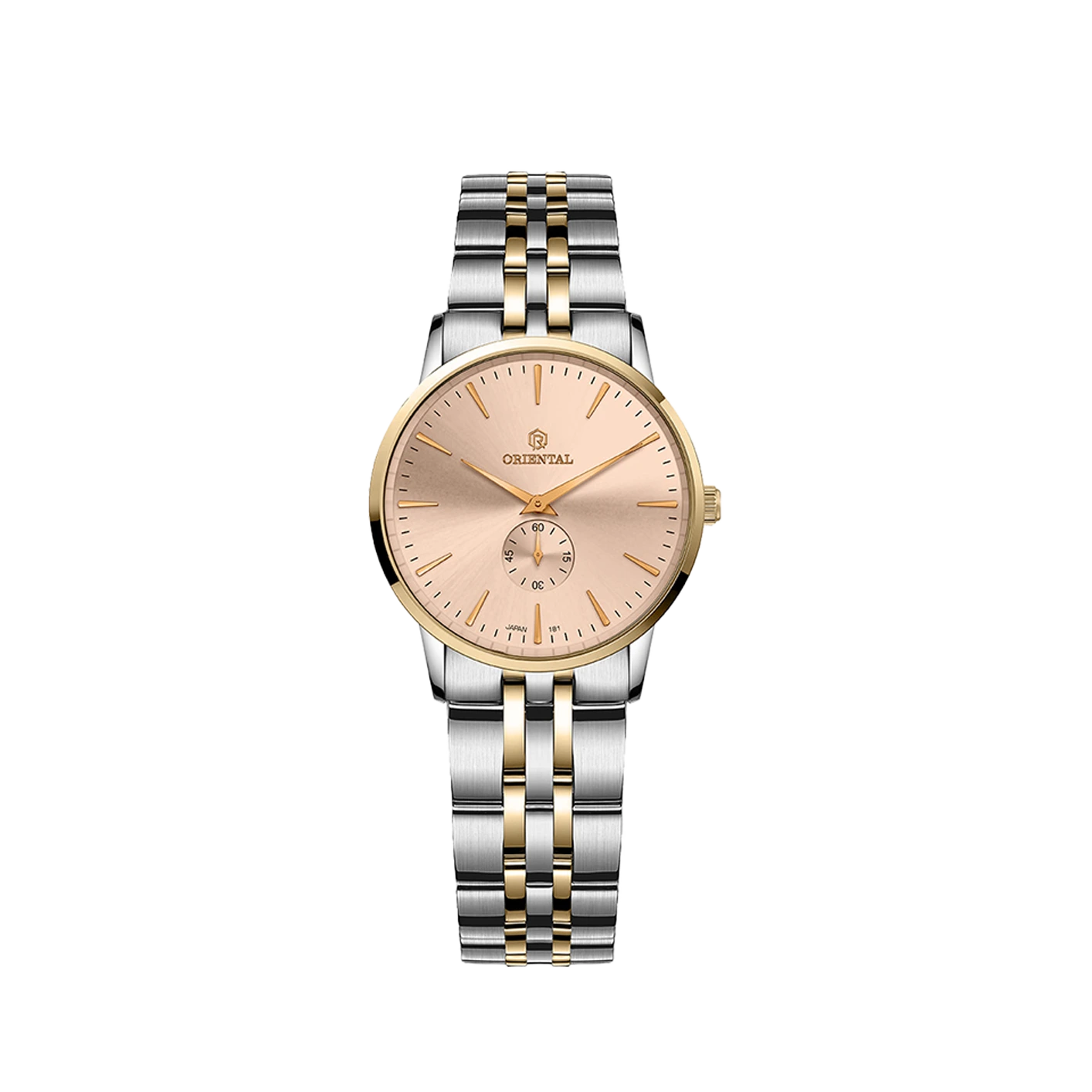 ساعت اورینتال زنانه کد O.SH181L-0016 یکی از مدلهای طراحیشده توسط برند اورینتال است که با ترکیب رنگ طلایی و صفحه شامپاین، ظاهری منسجم و یکپارچه دارد. این ساعت مچی زنانه با استفاده از بند فلزی استیل طلایی و قاب همرنگ ساخته شده و در صفحه خود علاوه بر عقربههای اصلی، یک بخش مجزا برای نمایش زیر ثانیه ارائه میدهد. استفاده از متریال مقاوم و رنگبندی خاص باعث شده این مدل در میان ساعتهای زنانه این برند جایگاه ویژهای داشته باشد.