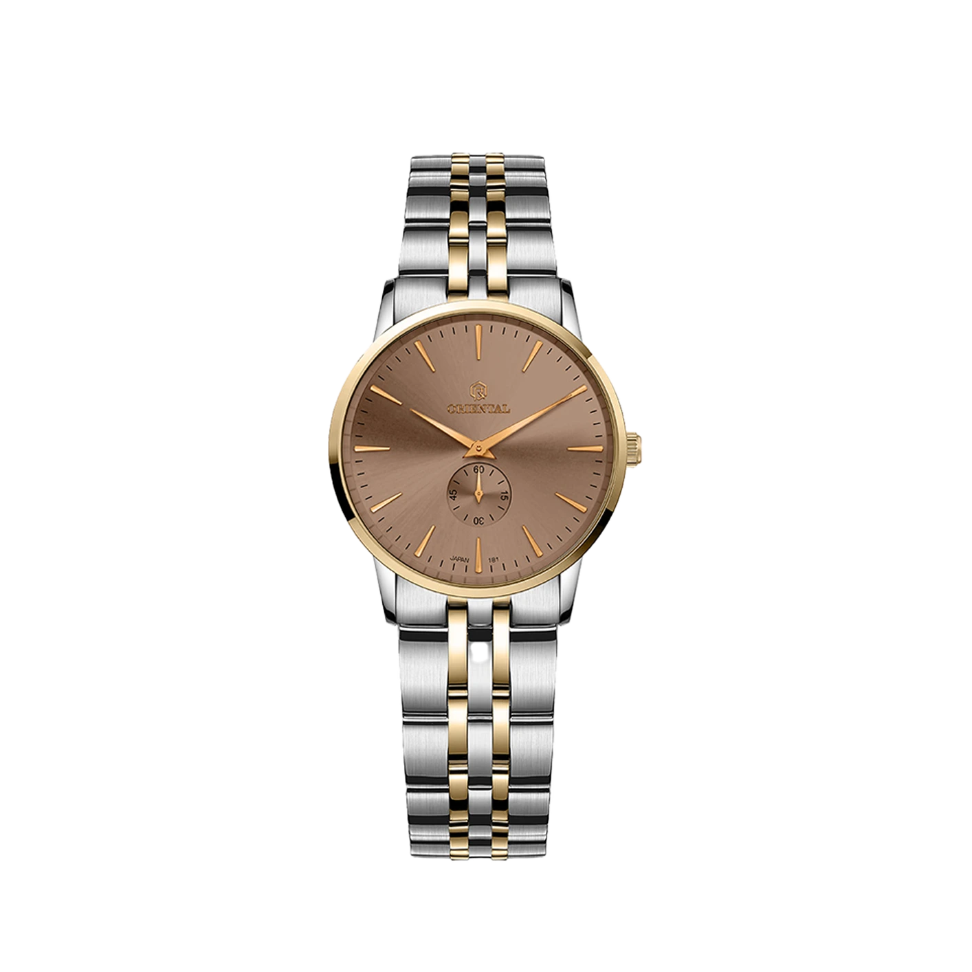ساعت اورینتال زنانه کد O.SH181L-0017 یکی از مدلهای طراحیشده توسط برند اورینتال در دسته ساعتهای مچی زنانه است. این محصول با استفاده از بند استیل طلایی و قاب همرنگ، ترکیبی هماهنگ از فلز براق و مقاوم را ارائه میدهد. صفحه طوسی رنگ در مرکز طراحی قرار گرفته و کنتراست مناسبی میان اجزای مختلف ساعت ایجاد کرده است. علاوه بر نمایش اصلی زمان، این مدل به قابلیت زیر ثانیه نیز مجهز است که در بخشی مجزا از صفحه قرار گرفته و عملکرد دقیقتری در نمایش زمان فراهم میکند.