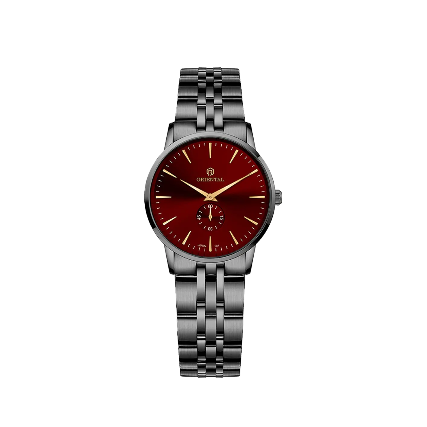 ساعت اورینتال زنانه کد O.SH181L-0103 یکی از مدل‌های سری رفرانس ۱۸۱ برند اورینتال است که با طراحی فلزی و ترکیب رنگ خاص تولید شده است. این ساعت مچی زنانه دارای بند فلزی دودی، قاب دودی و صفحه قرمز است. علاوه بر نمایش ساعت و دقیقه، این مدل به قابلیت زیر ثانیه نیز مجهز بوده و نمایش دقیق‌تر زمان را امکان‌پذیر می‌سازد. طراحی رنگی متفاوت صفحه در کنار بدنه فلزی دودی باعث شده این مدل از سایر ساعت‌های زنانه اورینتال متمایز باشد.